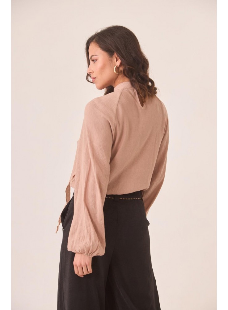 Blusa de Nekane, de gasa en ciolor rosa nude, con vlantes en parte delantera.