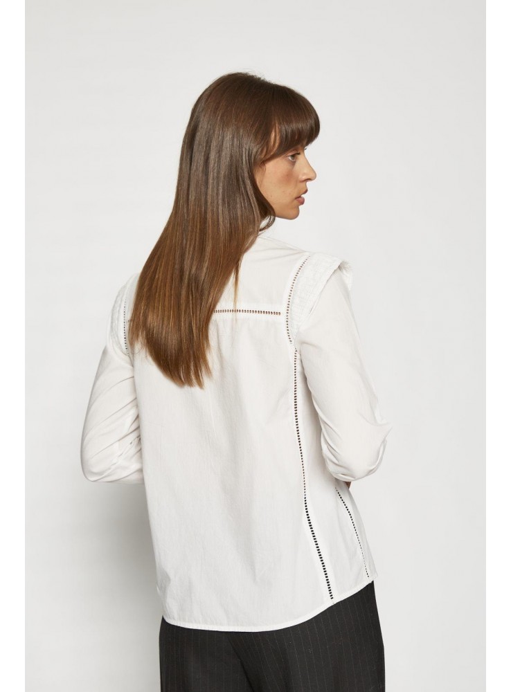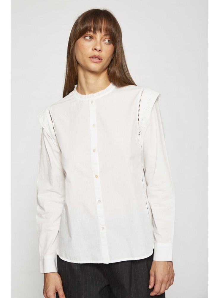 Blusa de Van Dos, de algodón suave con cuello mao fruncido, tapeta frontal con botones, detalles fruncidos en hombros y bordados sutiles.