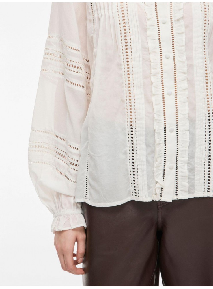 Preciosa blusa de Vila, en color blanco roto, con apliques de calados y jaretas a lo largo de toda la prenda.