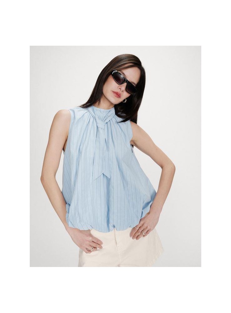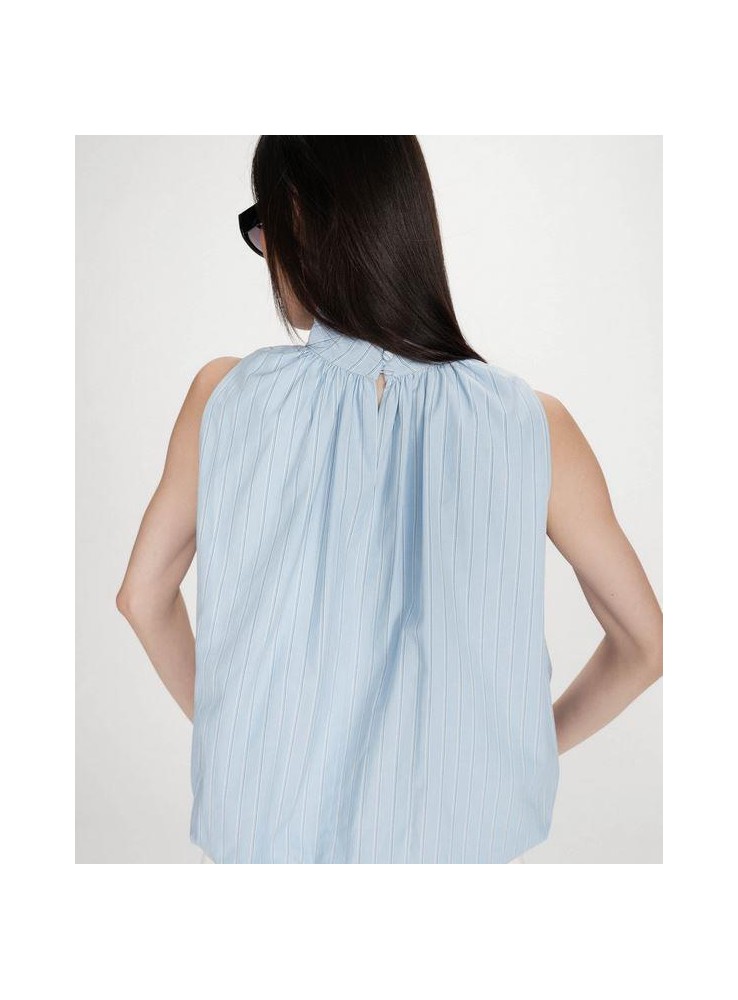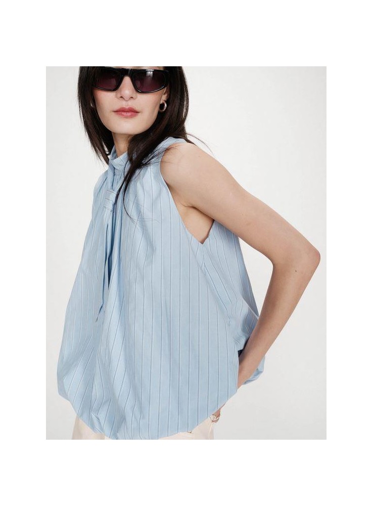 Precisa blusa Grace & Mila, de rayas de fondo celeste con rayas en blamco y azul.