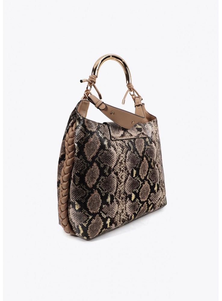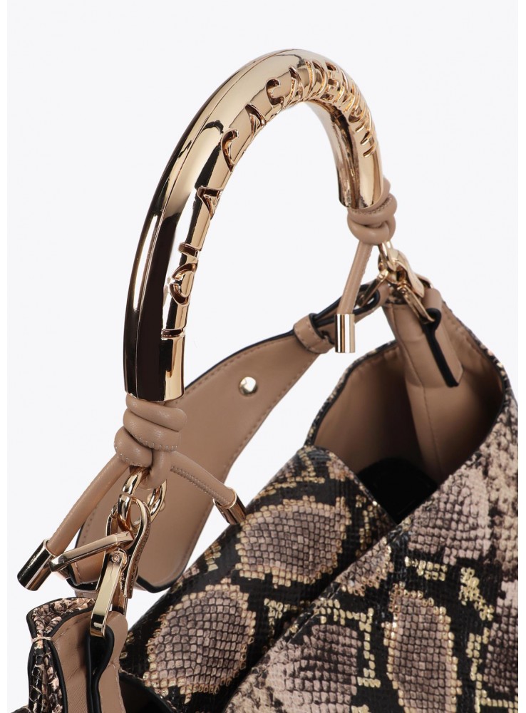 Este exclusivo bolso de Lola Casademunt, estilo shopper de efecto serpiente cuenta con una elegante asa metalizada con logotipo personalizado. Espacioso interior y cierre magnético. Ideal para un toque sofisticado en cualquier ocasión.