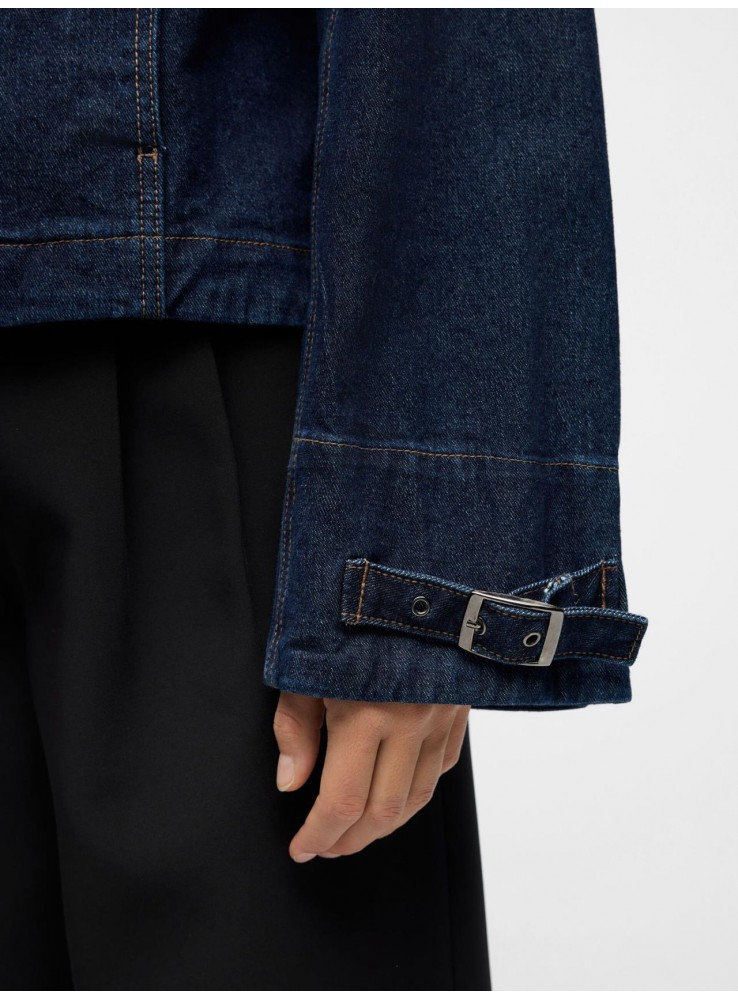 Chaqueta de Objec, en tejido denim oscuro. De cuello caja bastante abierto y botones tapados con solapa.