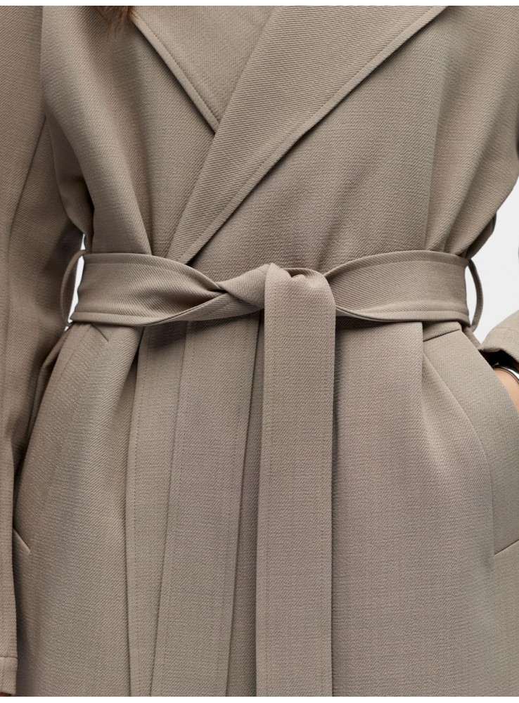Manga larga y cuello de solapas. Bolsillos delanteos y cinturòn del mismo tejido para ajustarlo.