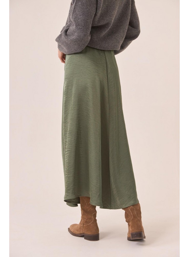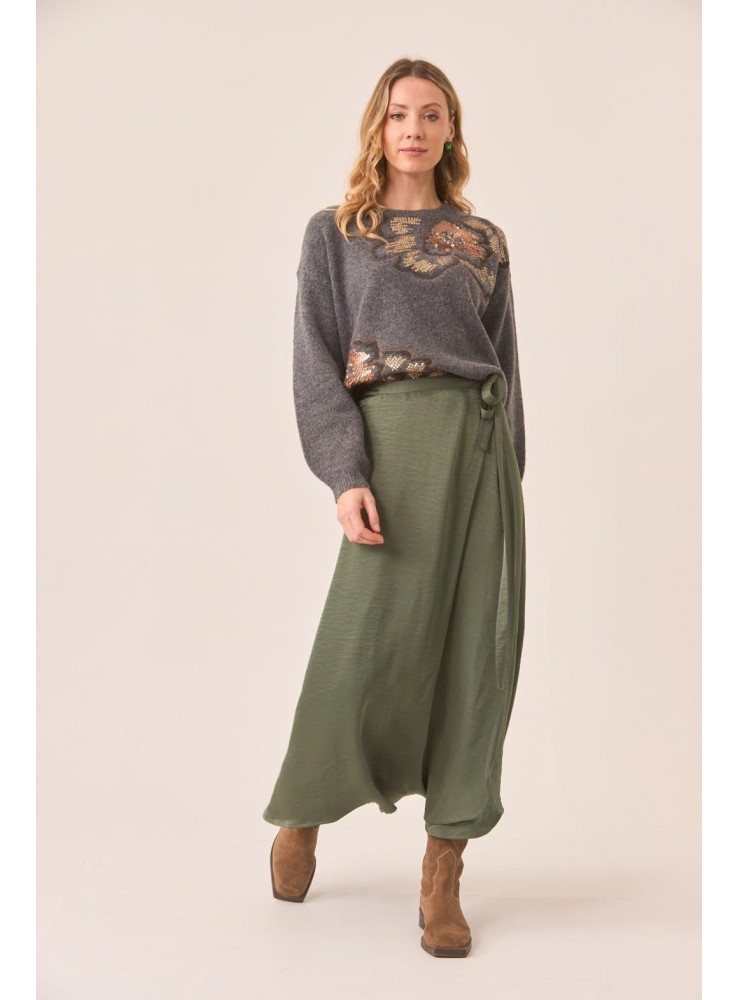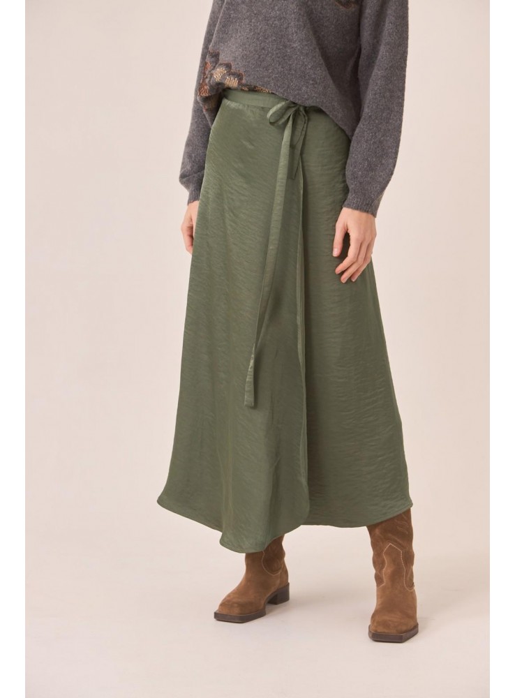 Falda de Nekane, larga en tejido satinado, cruzada y anudada en la cintura.