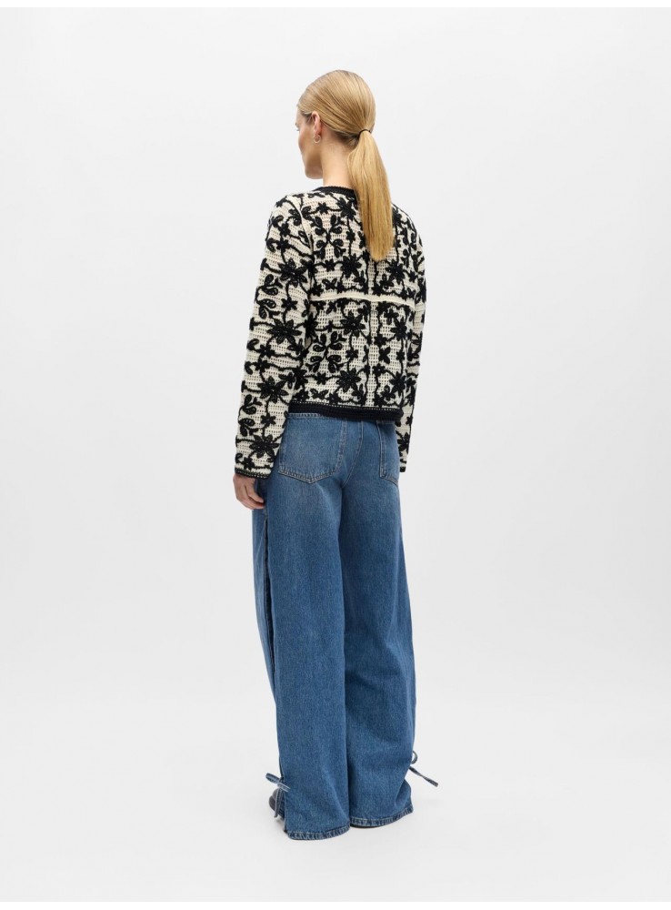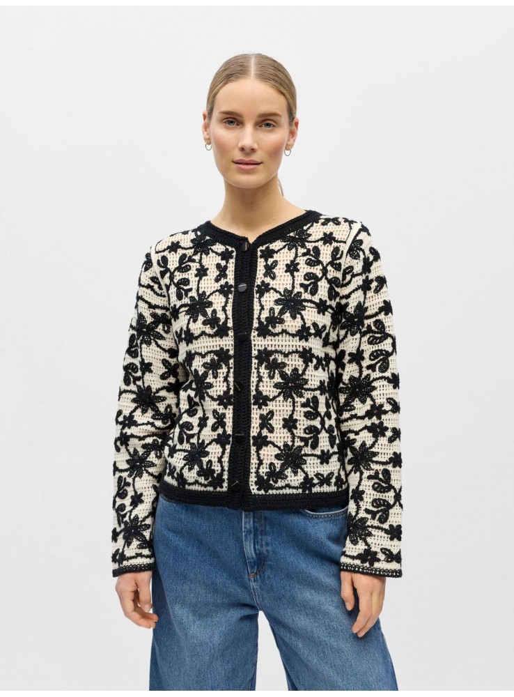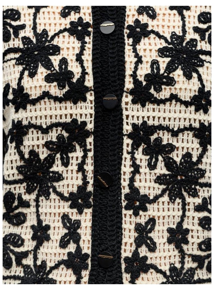 Rebeca de Object, de manga larga y cuello redondo, en crochet de algodón en color blanco con flores bordadas en negro.