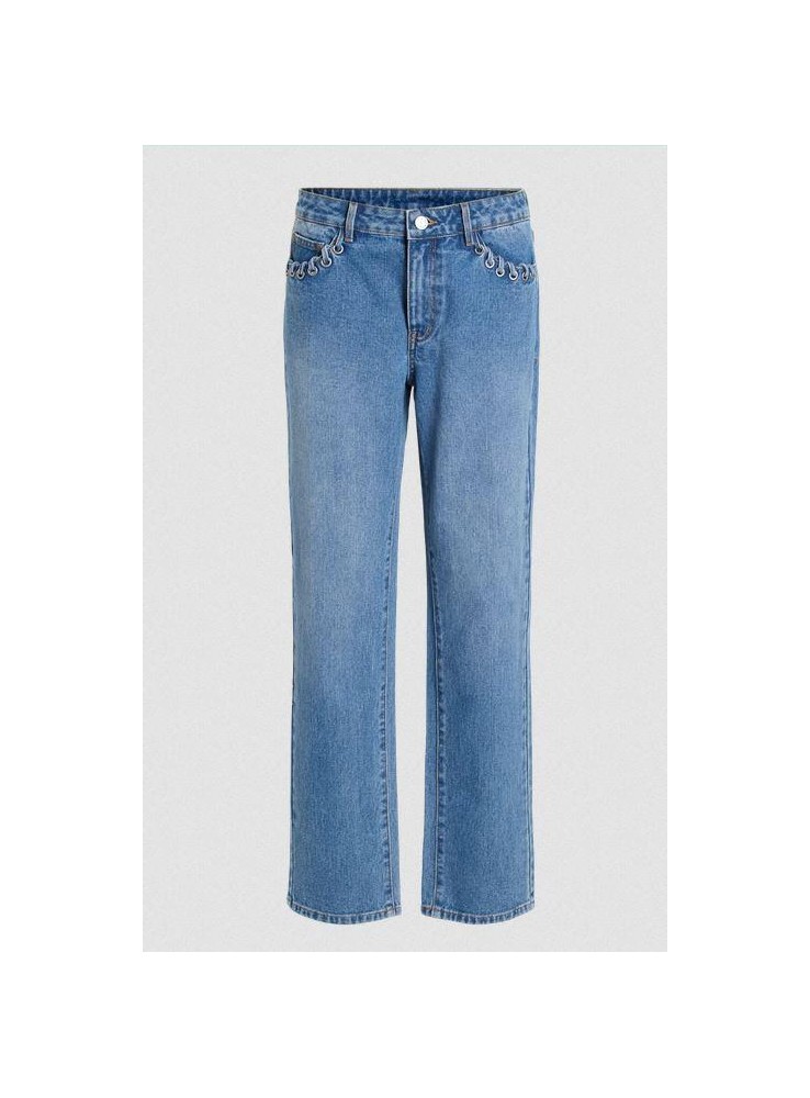 Vaquero Vila, de cintura media y pierna recta. Con adorno de cordòn del mismo tejido en los bolsillos delanteros.