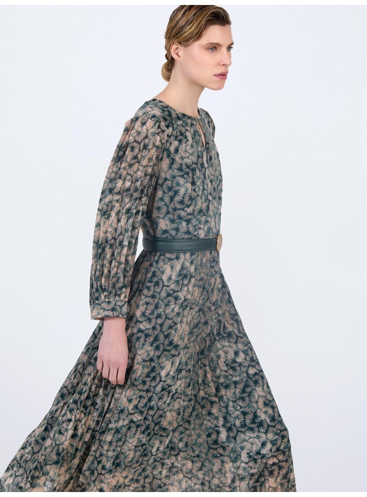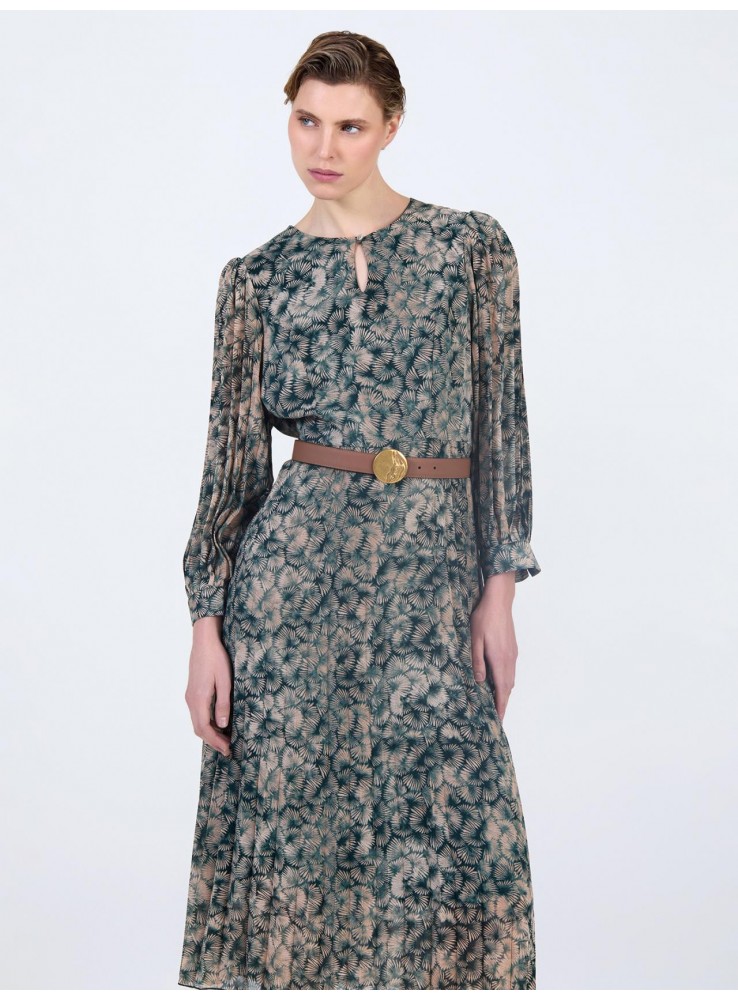 Vestdio de Skatie, de manga larga plisada y largo midi. Detalle de apertura en el pecho.